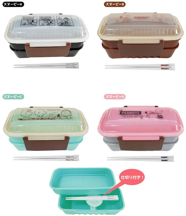 やさしい色づかいで使いやすい!スヌーピーのかわいいお箸付きの2段ランチボックスです。